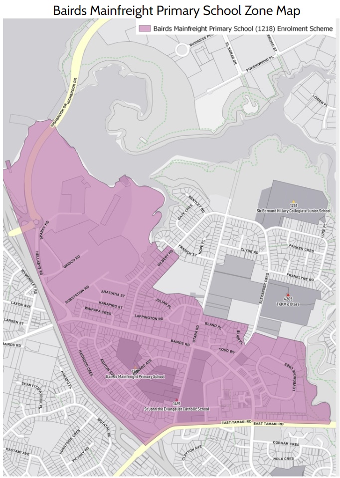 BMPS zone mapAll children in Years 1-6 who live within the home zone described below and/or shown on the attached map are entitled to enrol at Bairds Mainfreight Primary School.
